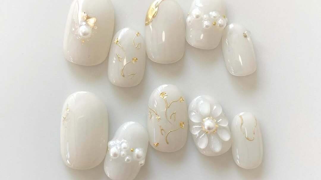 こちらのパールネイルは、ホワイトベースにパールパーツが馴染んでいます。奥行き感のあるニュアンスアートがおしゃれな雰囲気です。