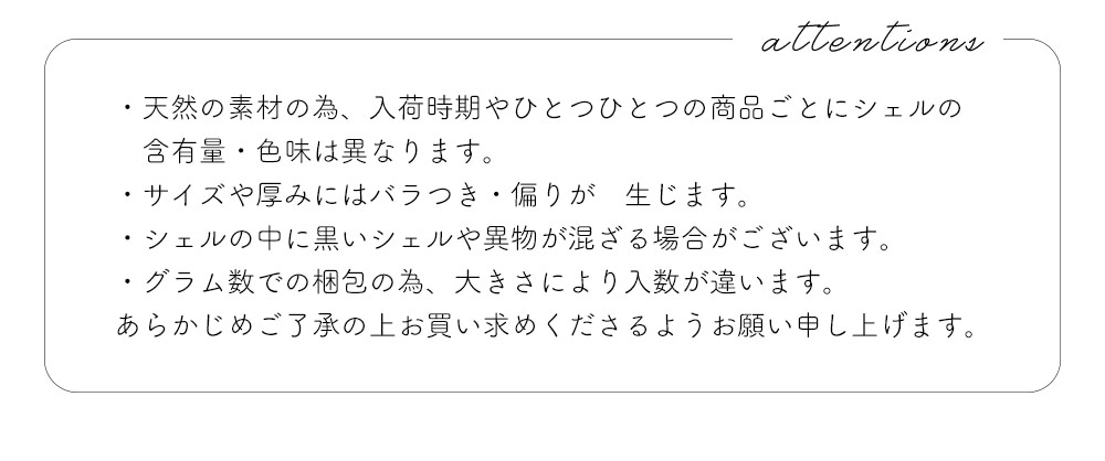 ※天然の素材の為、入荷時期やひとつひとつの商品ごとにシェルの含有量・色味は異なります。