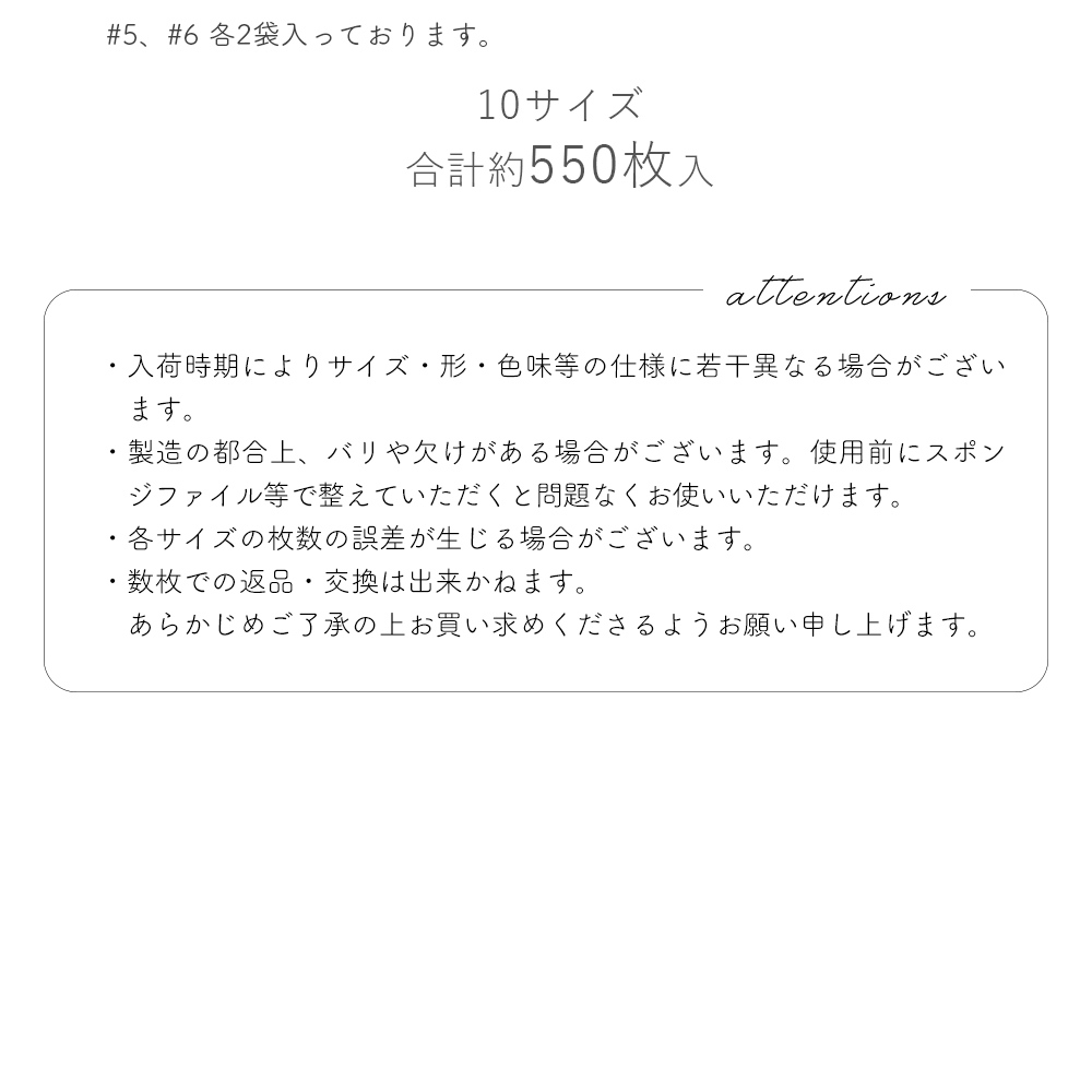 ※製造の都合上、バリや欠けがある場合がございます。 使用前にスポンジファイル等で先端を整えていただくと問題なくお使いいただけます。 ※各サイズの枚数の誤差が生じる場合がございます。 ※数枚での返品・交換は出来かねます。 ※お使いのブラウザや、画面設定により商品のカラーが異なって見える場合がございます。