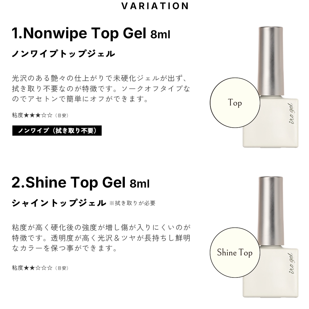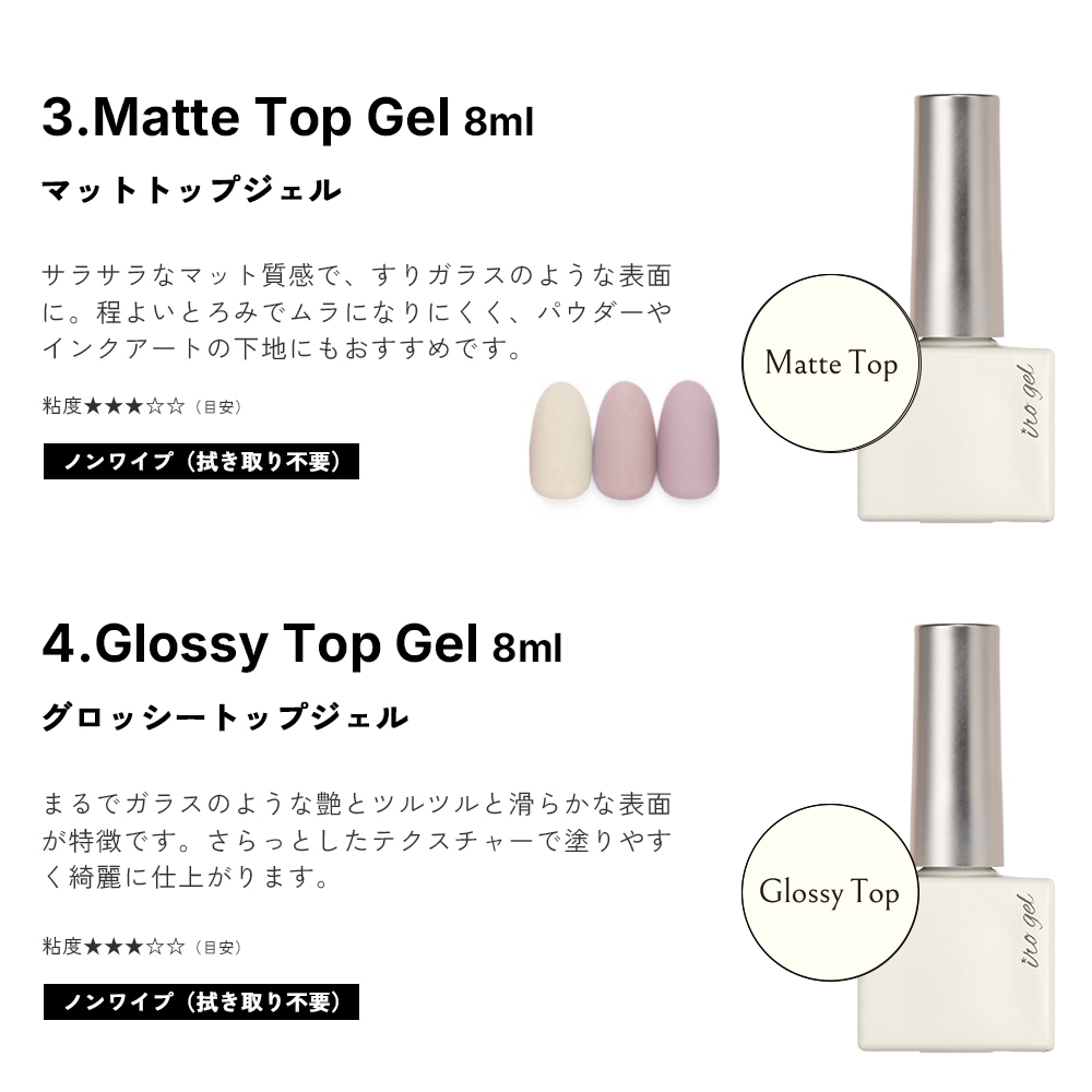 ・ノンワイプ マットトップジェル:ご使用前に軽く容器を振ってください。