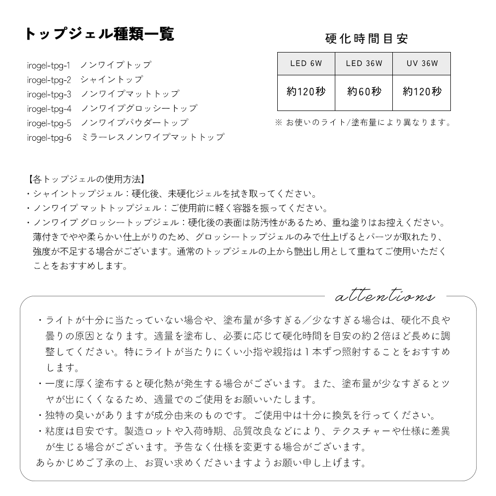 ・シャイントップジェル:硬化後、未硬化ジェルを拭き取ってください。