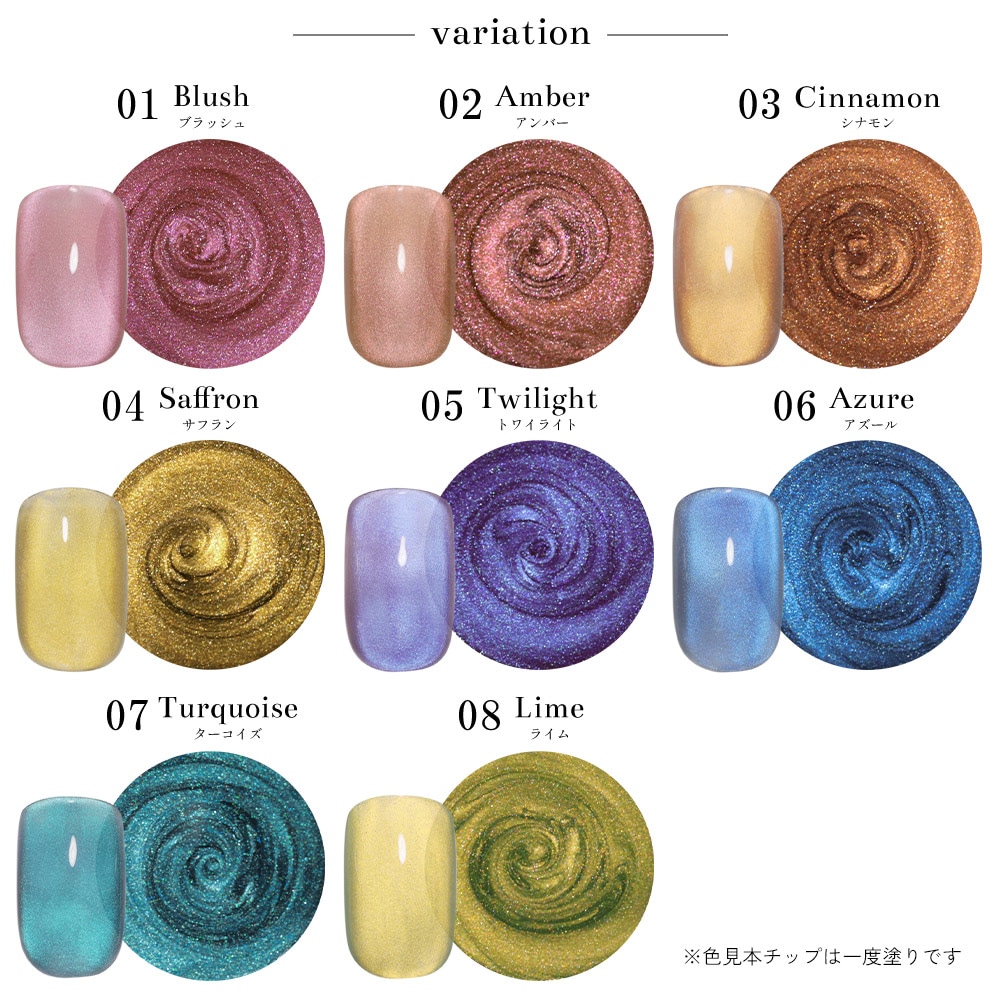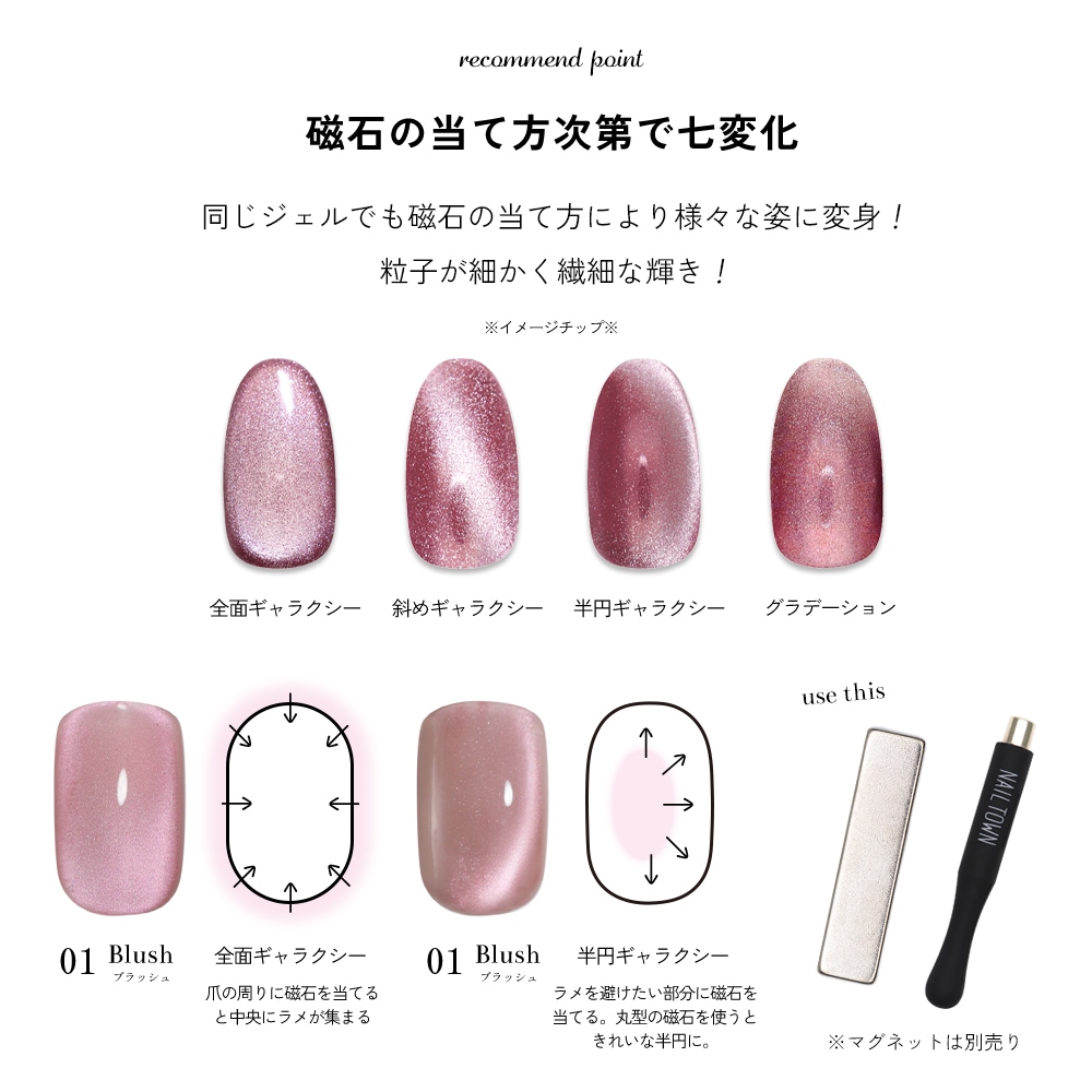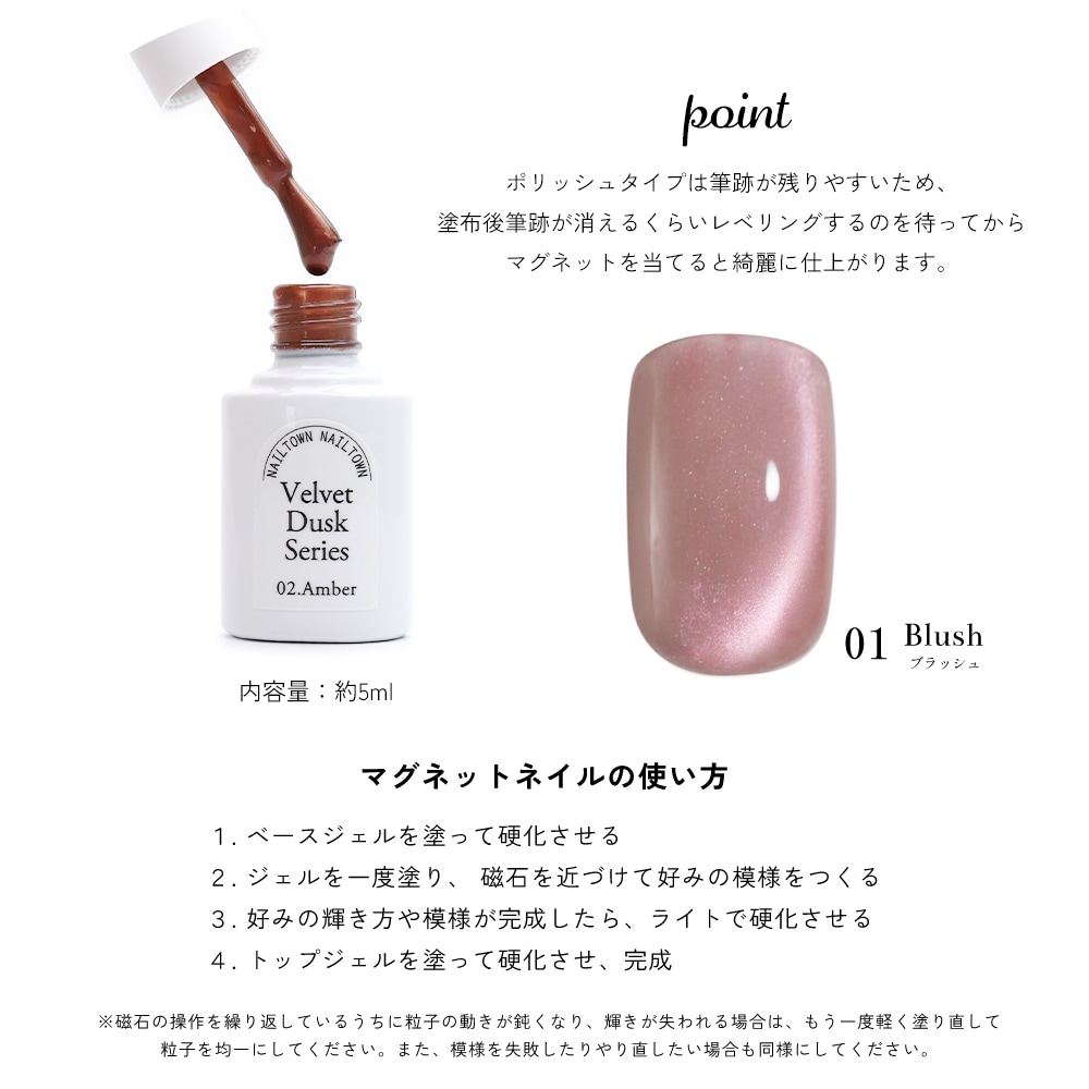・ポリッシュタイプは筆跡が残りやすいため、塗布後筆跡が消えるくらいレベリングするのを待ってからマグネットを当てると綺麗に仕上がります。