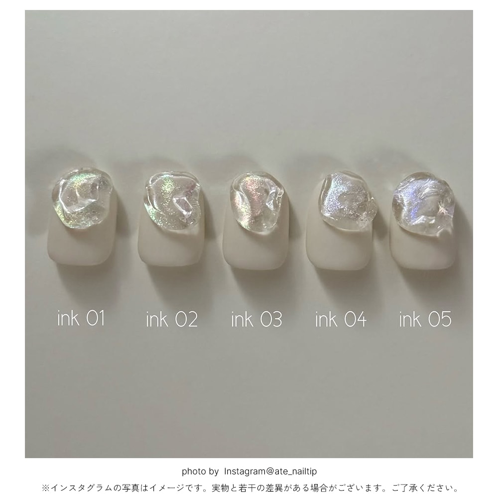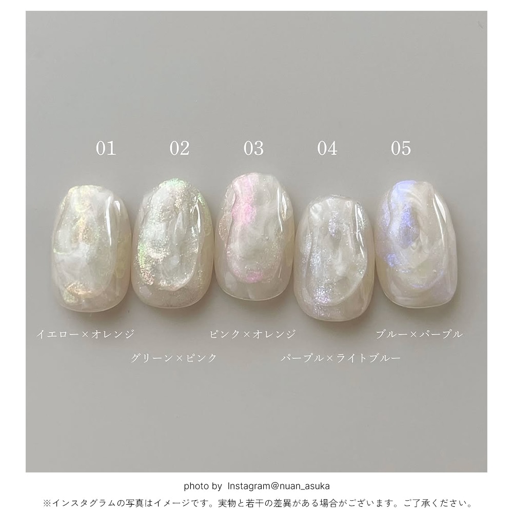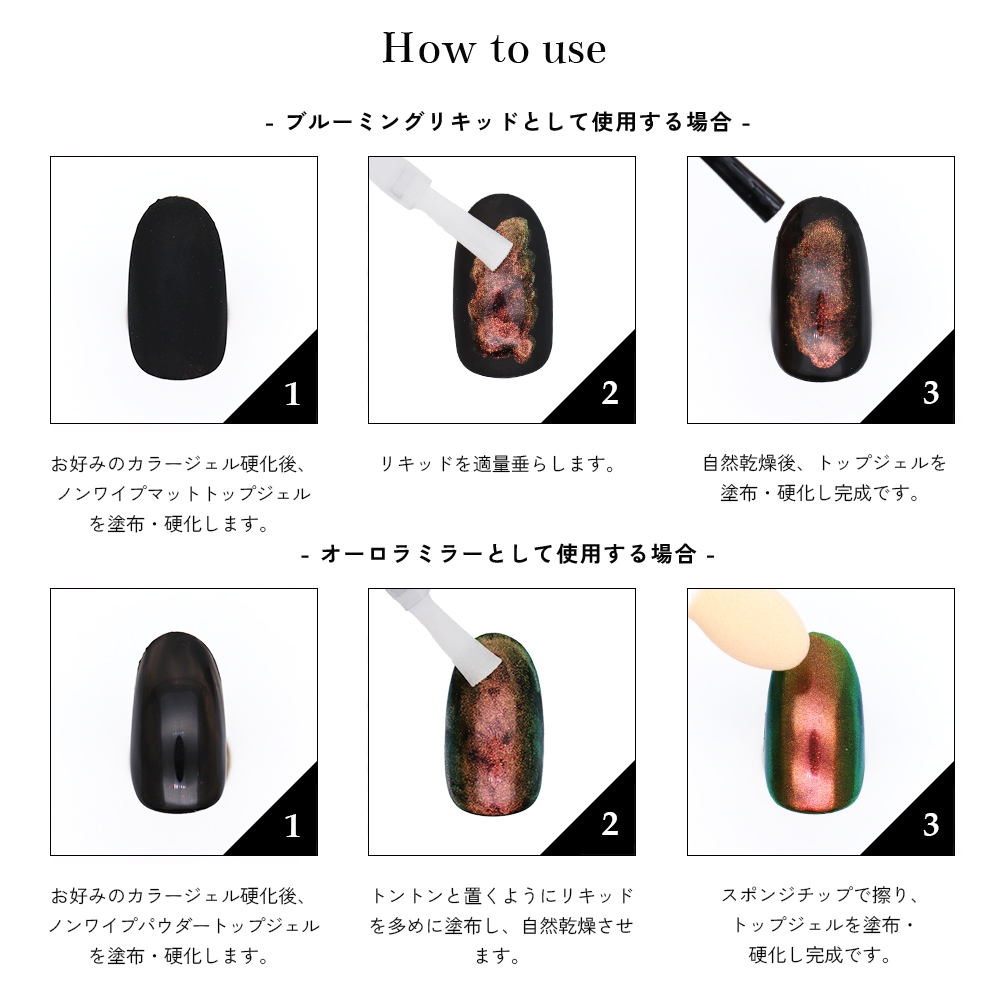 ジェルの上に垂らすだけで、オーロラ粒子がふわっと広がり、指先に幻想的な輝きを生み出します。