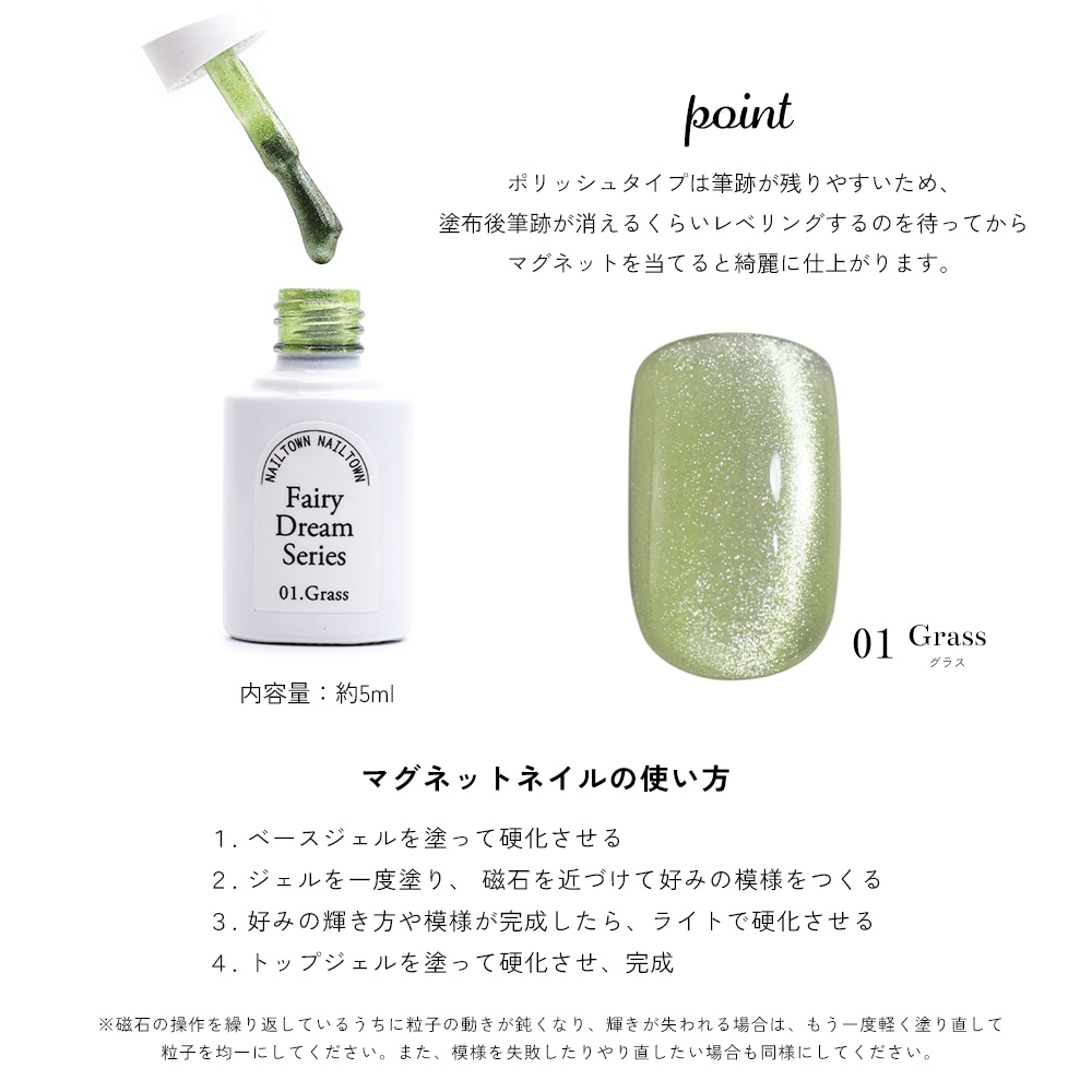 ジェルネイル用品 > ジェル > ポリッシュタイプジェル > 【ネコポス送料無料】輝く粒子 マグネットネイル ネイルタウンジェル ポリッシュタイプ フェアリードリームシリーズ 黒くなりにくい 全6色セット 全色セット 約5ml ボトルジェル