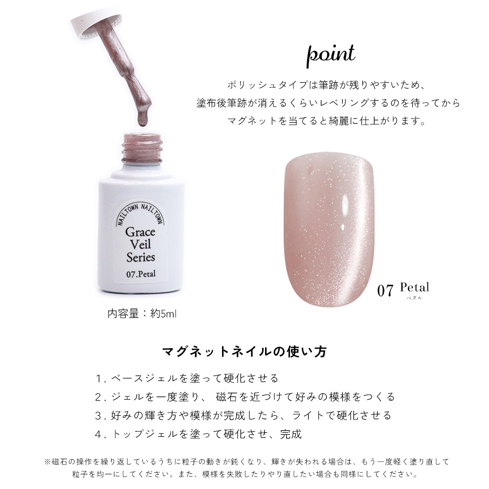 ・ポリッシュタイプは筆跡が残りやすいため、塗布後筆跡が消えるくらいレベリングするのを待ってからマグネットを当てると綺麗に仕上がります。