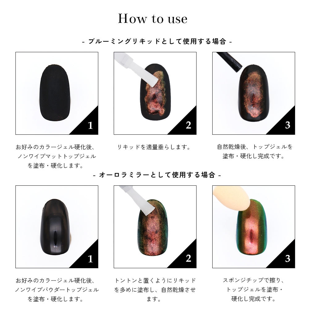 ジェルの上に垂らすだけで、オーロラ粒子がふわっと広がり、指先に幻想的な輝きを生み出します。