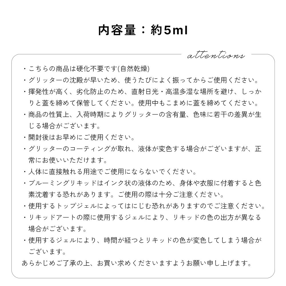 ・ブルーミングリキッドはインク状の液体のため、身体や衣服に付着すると色素沈着する恐れがあります。ご使用の際は十分ご注意ください。