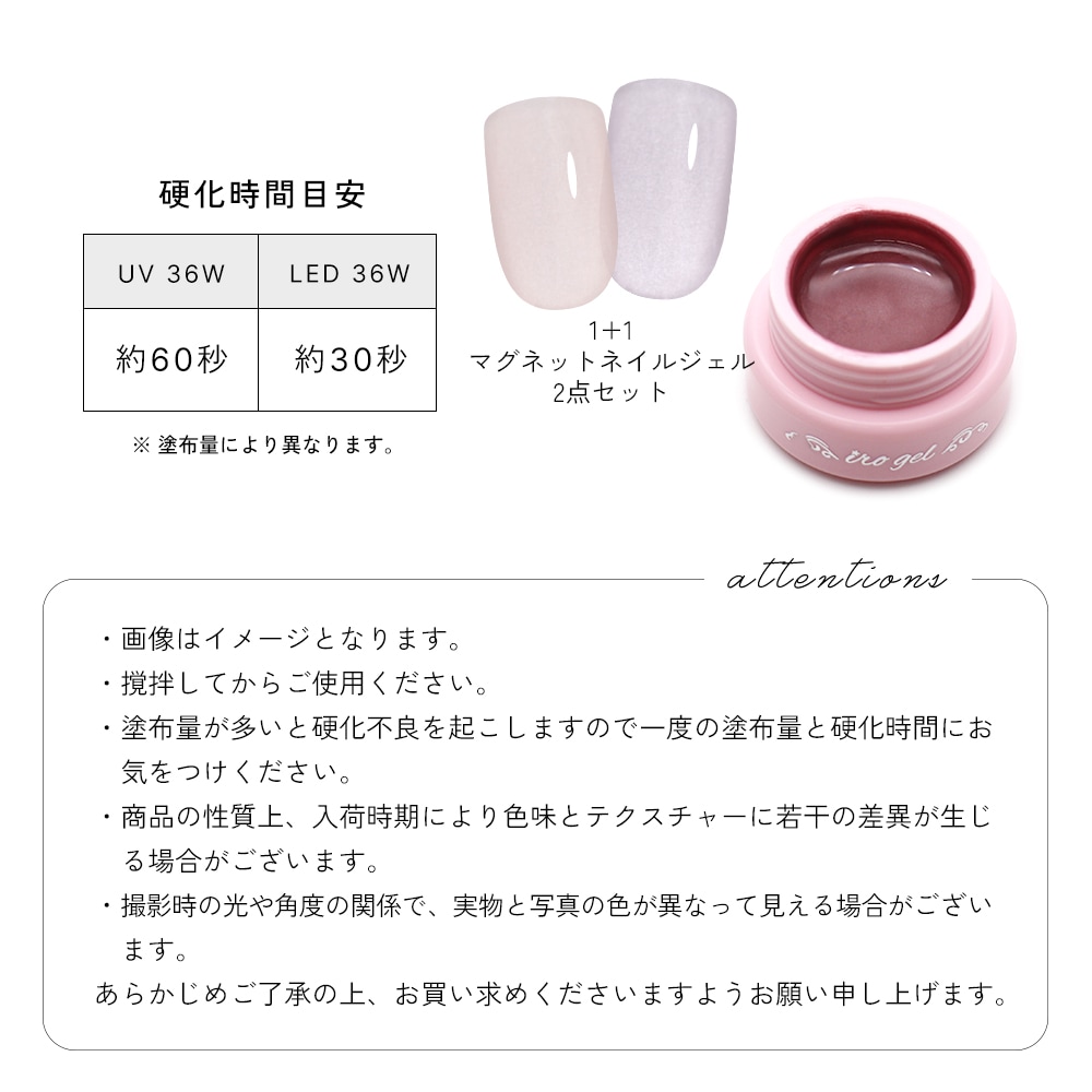 ジェルネイル用品 > ジェル > お得な1+1 > 【ポイント10倍★2/13 10:00まで】【ネコポス送料無料】厳選2色セット 超微粒子3ミクロン マグネットネイル irogel MGシリーズ vol.7 約3g入り お任せカラー 黒くなりにくい