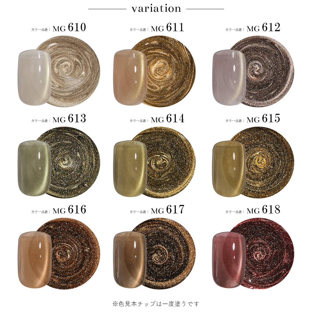 トップ > ブランド別 > irogel(イロジェル) > irogel MGシリーズ > 【ネコポス送料無料】MG610-MG618 全9色セット 超微粒子4ミクロン マグネットネイル irogel MGシリーズ vol.6 約3g入り 透明感 クリアカラー ゴールドマグ粒子 黒くなりにくい