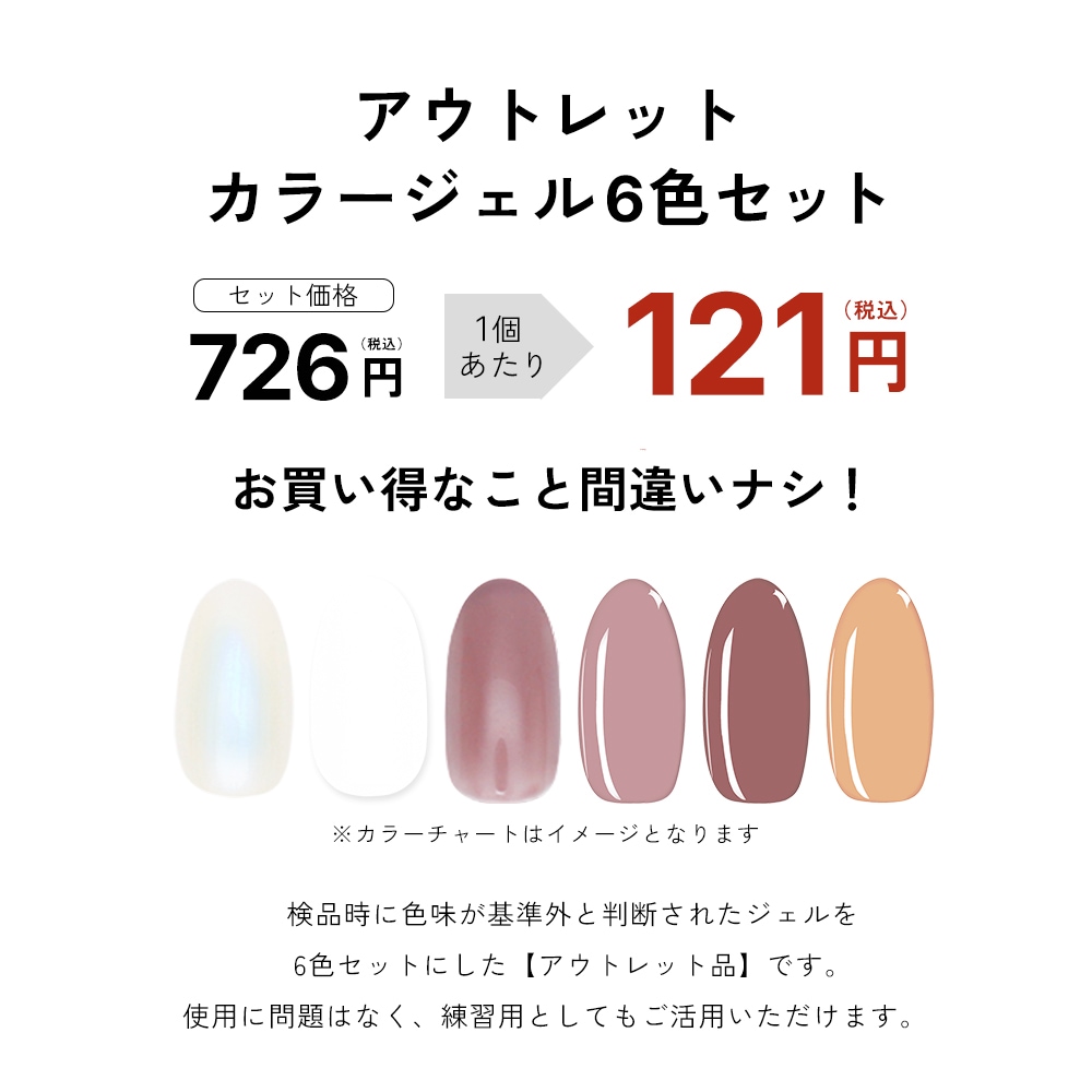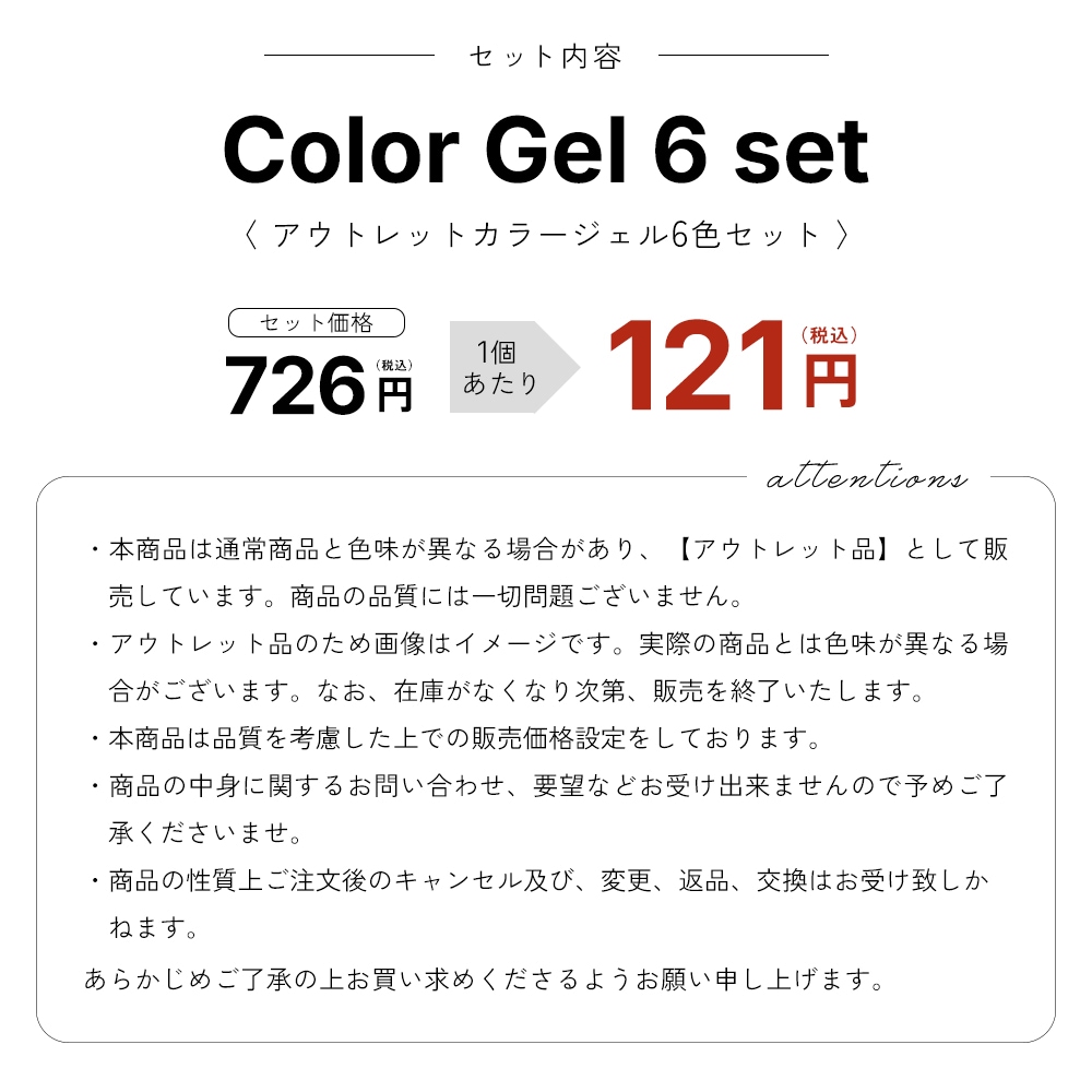 本商品は、通常品の検品基準から外れた カラージェル6色をセットにした【アウトレット品】です。